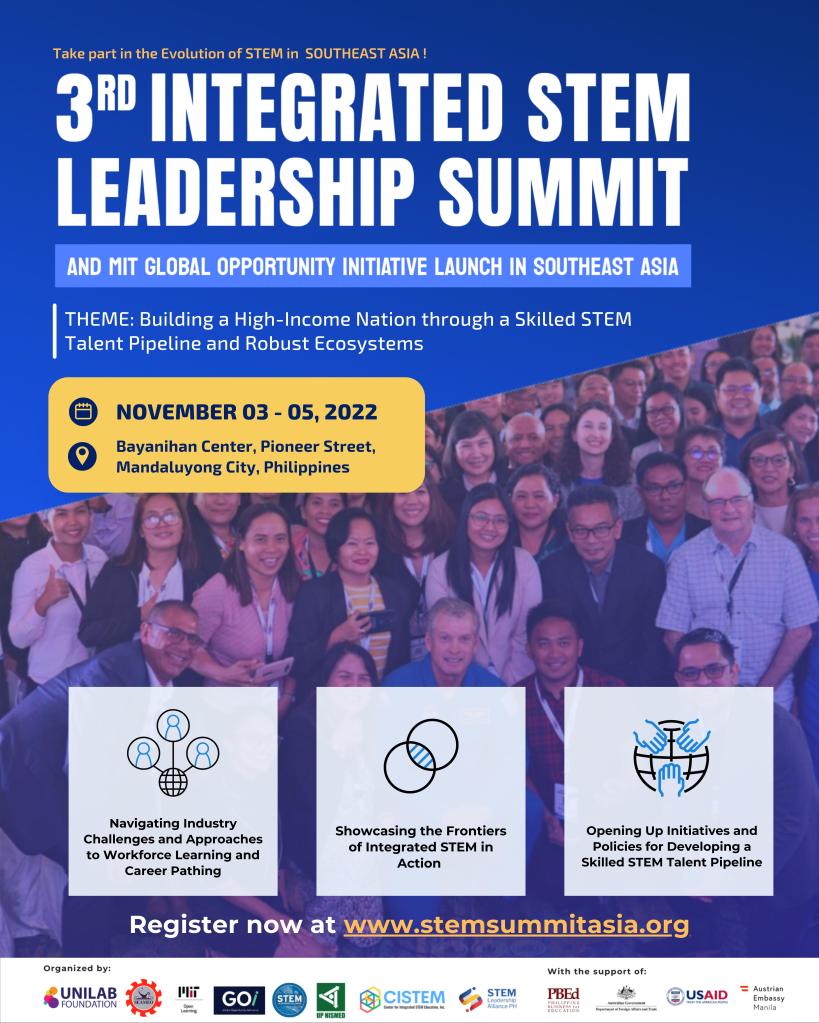 For the third year since 2019, leaders from the government, academe, industry and the Science, Technology, Engineering, and Mathematics (STEM) community will converge for a three-day 3rd Integrated STEM Leadership Summit and launch of MIT Global Opportunity Initiative in Southeast Asia on November 3-5, 2022 in Mandaluyong City with the theme: Building a High-Income Nation through a skilled STEM talent pipeline and Robust Ecosystem.